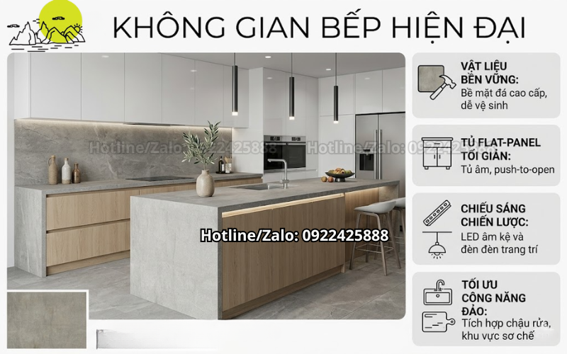 Sự pha trộn giữa nét mộc mạc và hiện đại khiến loại đá này cực kỳ được ưa chuộng trong gian bếp. Khi được xử lý chống thấm tốt bằng công nghệ cao, nó hoàn toàn có thể được sử dụng làm đá ốp bàn bếp hoặc ốp vách tường bếp (backsplash). Sự kết hợp giữa bàn bếp mang hiệu ứng “concrete-look” cùng hệ tủ bếp Acrylic hay gỗ tự nhiên sẽ tạo ra một không gian nấu nướng tràn đầy cảm hứng.
